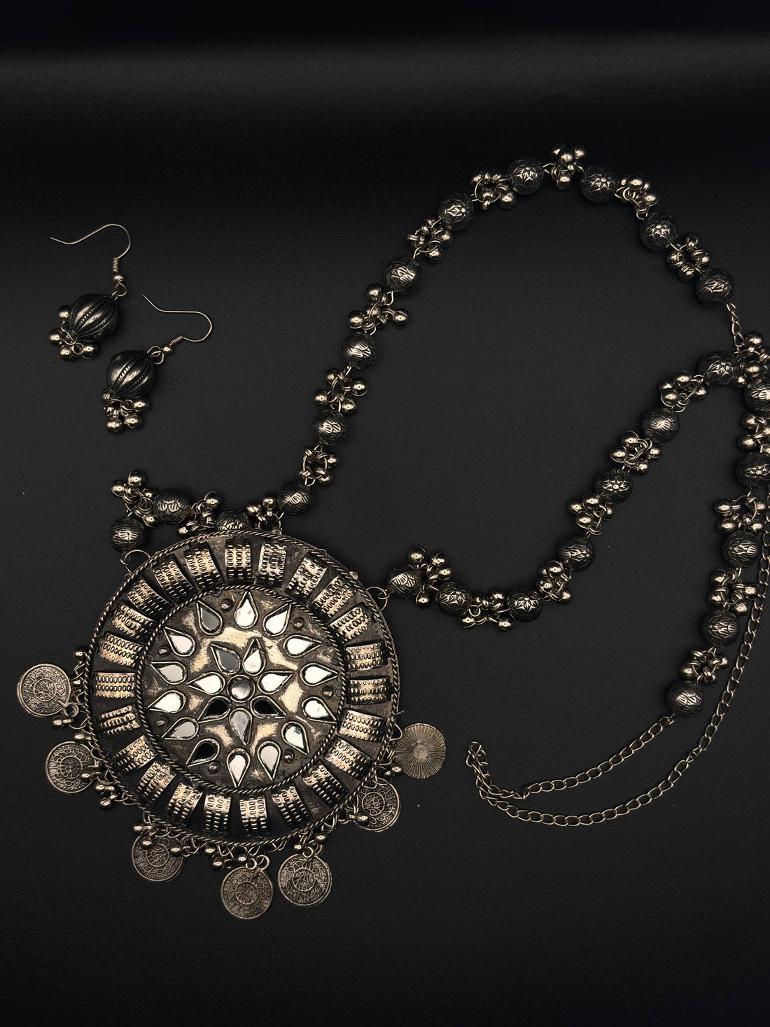 Oxidized Silver Mala Set Experience the unique allure of traditional Indian oxidized jewelry with this...