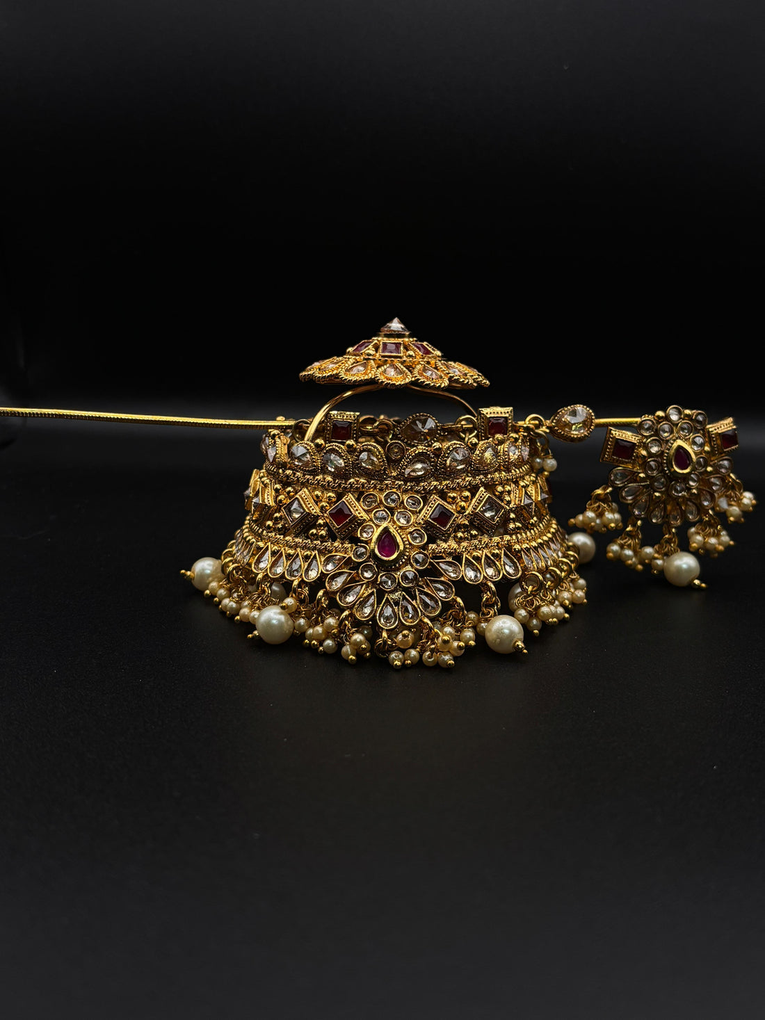 Crafted in antique gold with deep maroon stones and pearls, this Royal Jhoomer is the...