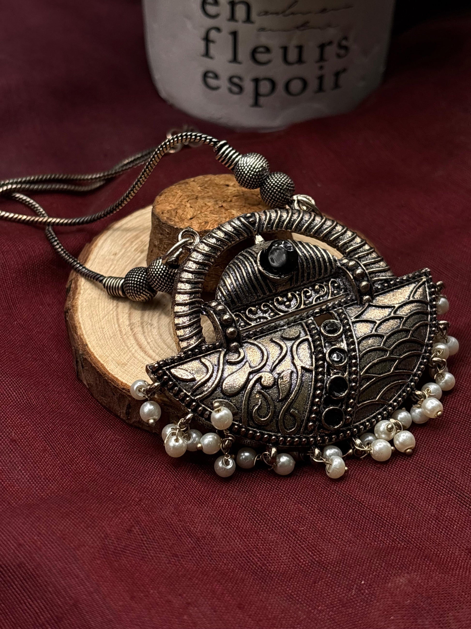 Experience the unique allure of traditional Indian oxidized jewelry with this striking Oxidized Silver Mala Set, designed to add a touch of cultural elegance to any look. This exquisite jewelry set is crafted to showcase the timeless beauty of oxidized silver, making it an ideal choice for those who appreciate classic charm and intricate detailing.