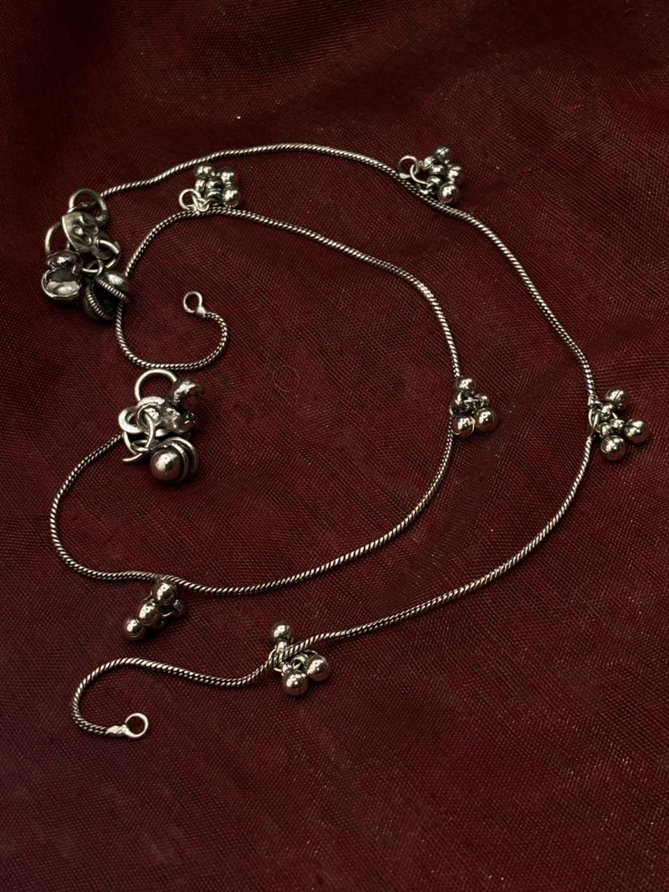 Crafted from authentic oxidized silver, this payal is treated with a specialized chemical process using liver of sulfur to achieve its darkened, antique finish. This tarnished effect highlights the intricate detailing and depth of design, giving it a unique vintage appeal that is both elegant and evocative of traditional Indian jewelry-making techniques. This two-piece set allows you to adorn both ankles in perfect harmony, highlighting the artistry and tradition of Indian jewelry-making.