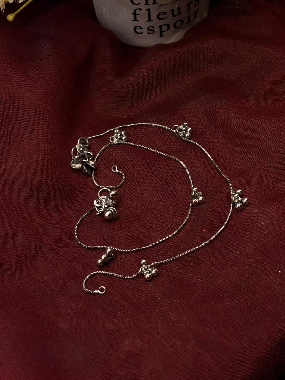 Adorn your ankles with the classic beauty of our Oxidized Silver Payal , a piece that exudes traditional charm and artisanal craftsmanship. This payal (anklet) is perfect for adding a subtle yet captivating touch to any attire, from festive outfits to casual wear.