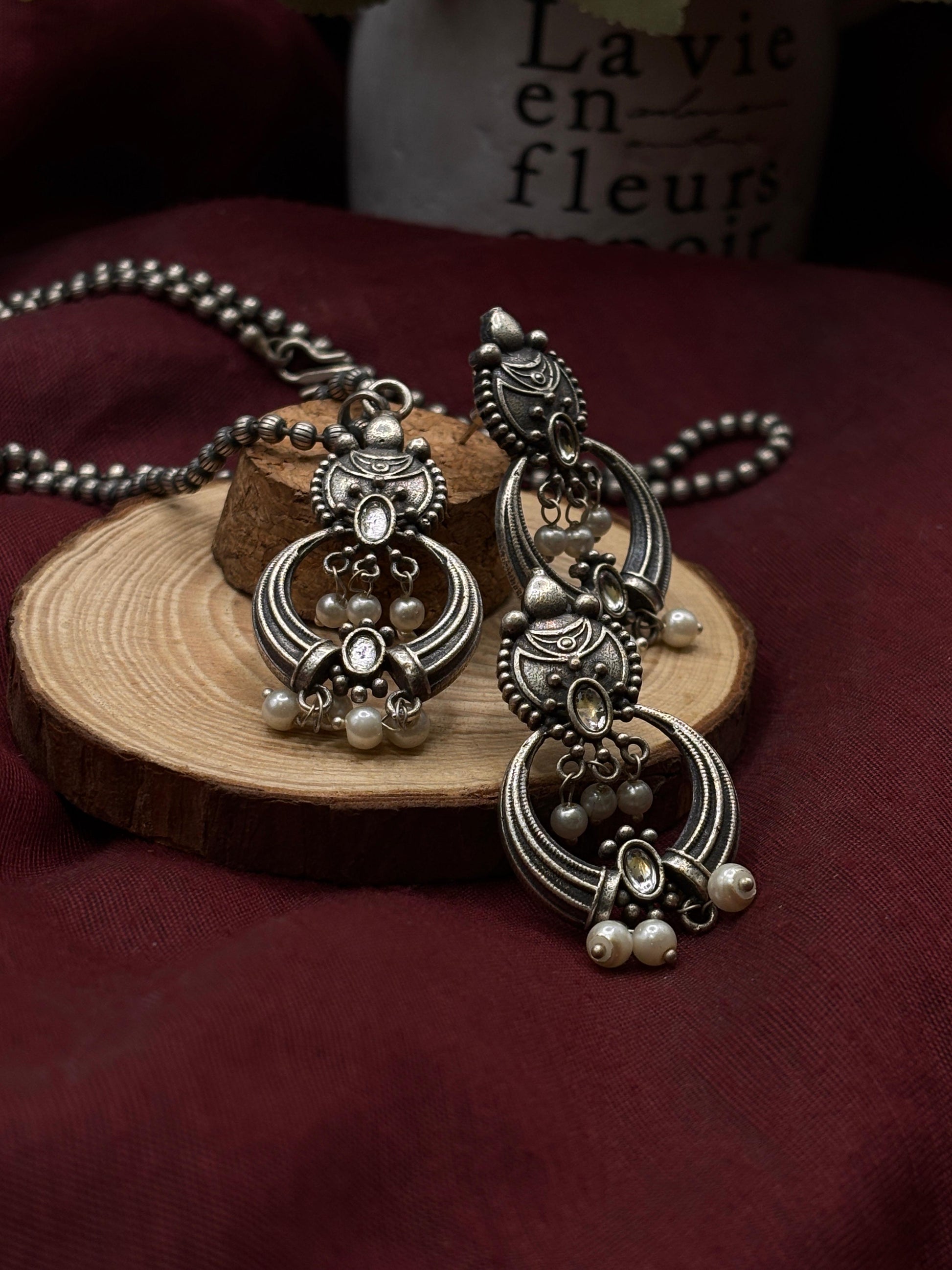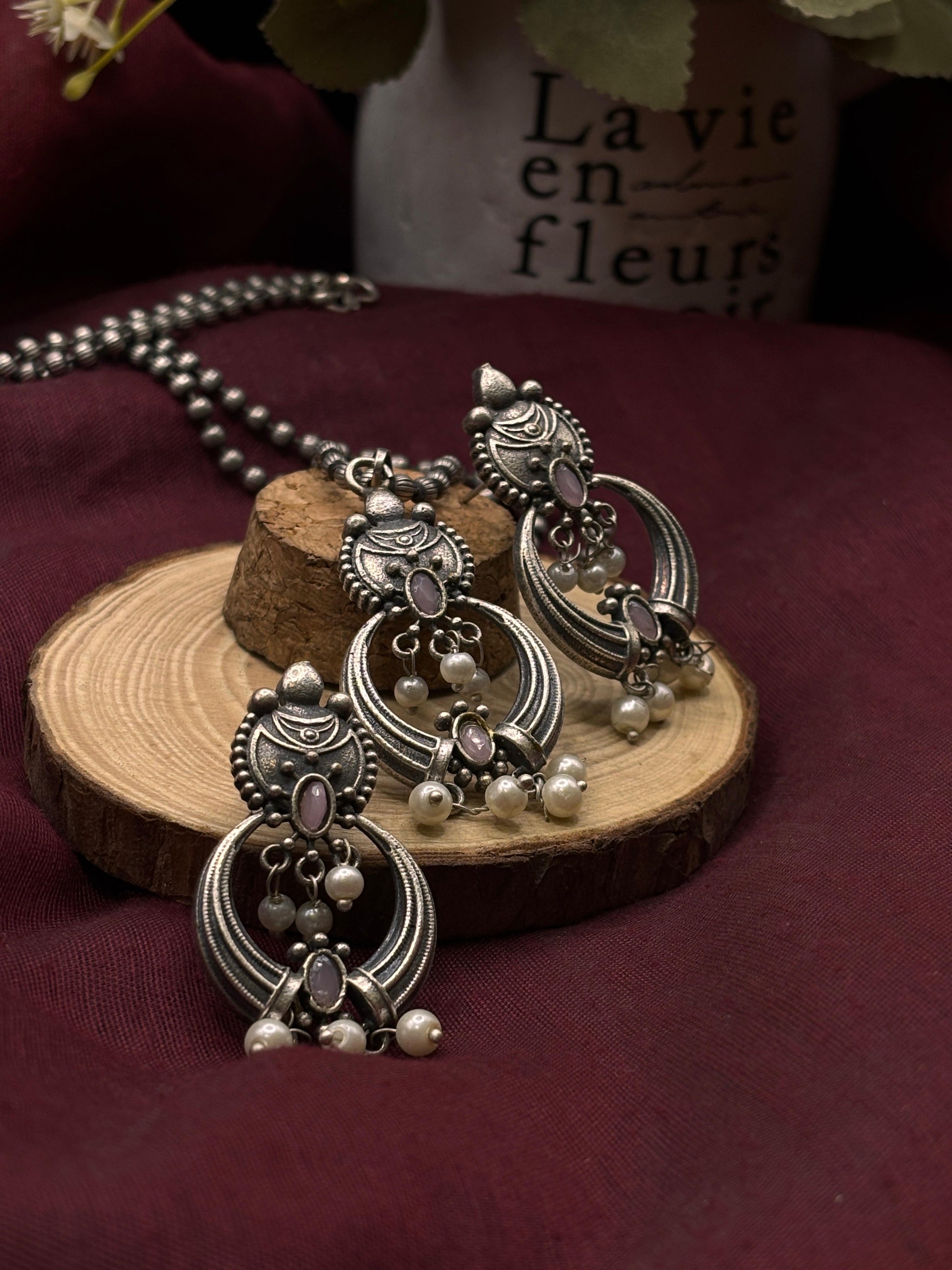 Experience the unique allure of traditional Indian oxidized jewelry with this striking Oxidized Silver Mala Set, designed to add a touch of cultural elegance to any look. This exquisite jewelry set is crafted to showcase the timeless beauty of oxidized silver, making it an ideal choice for those who appreciate classic charm and intricate detailing.