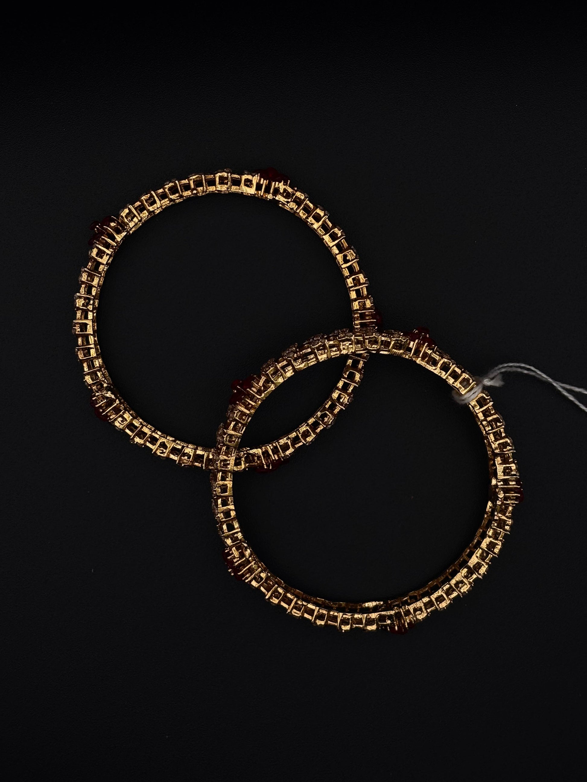 These bangles embody sophistication and elegance, featuring a delicate lattice design encrusted with shimmering stones that catch the light beautifully. The vibrant red crystals symbolize love and strength, while the clear white stones add a touch of brilliance, making them the perfect statement accessory for weddings, festive occasions, or grand celebrations.