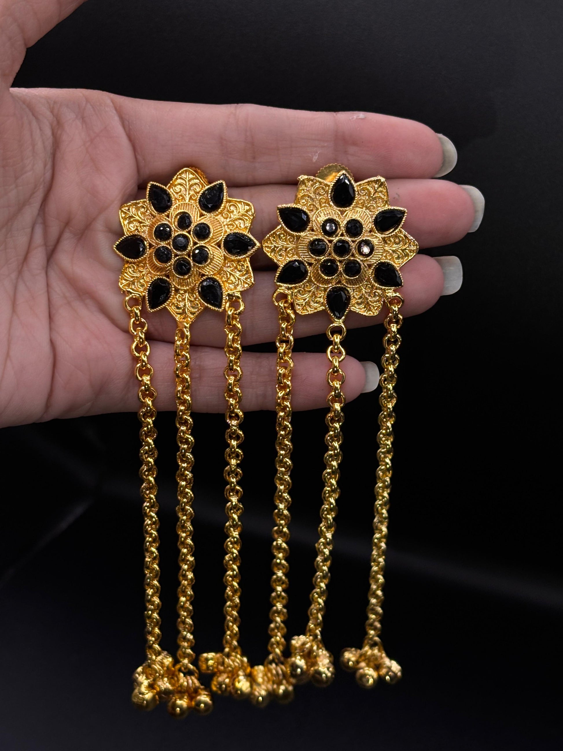 These black stone floral ghungroo chain earrings combine classic craftsmanship with modern elegance, making them a stunning addition to any jewelry collection. ✨