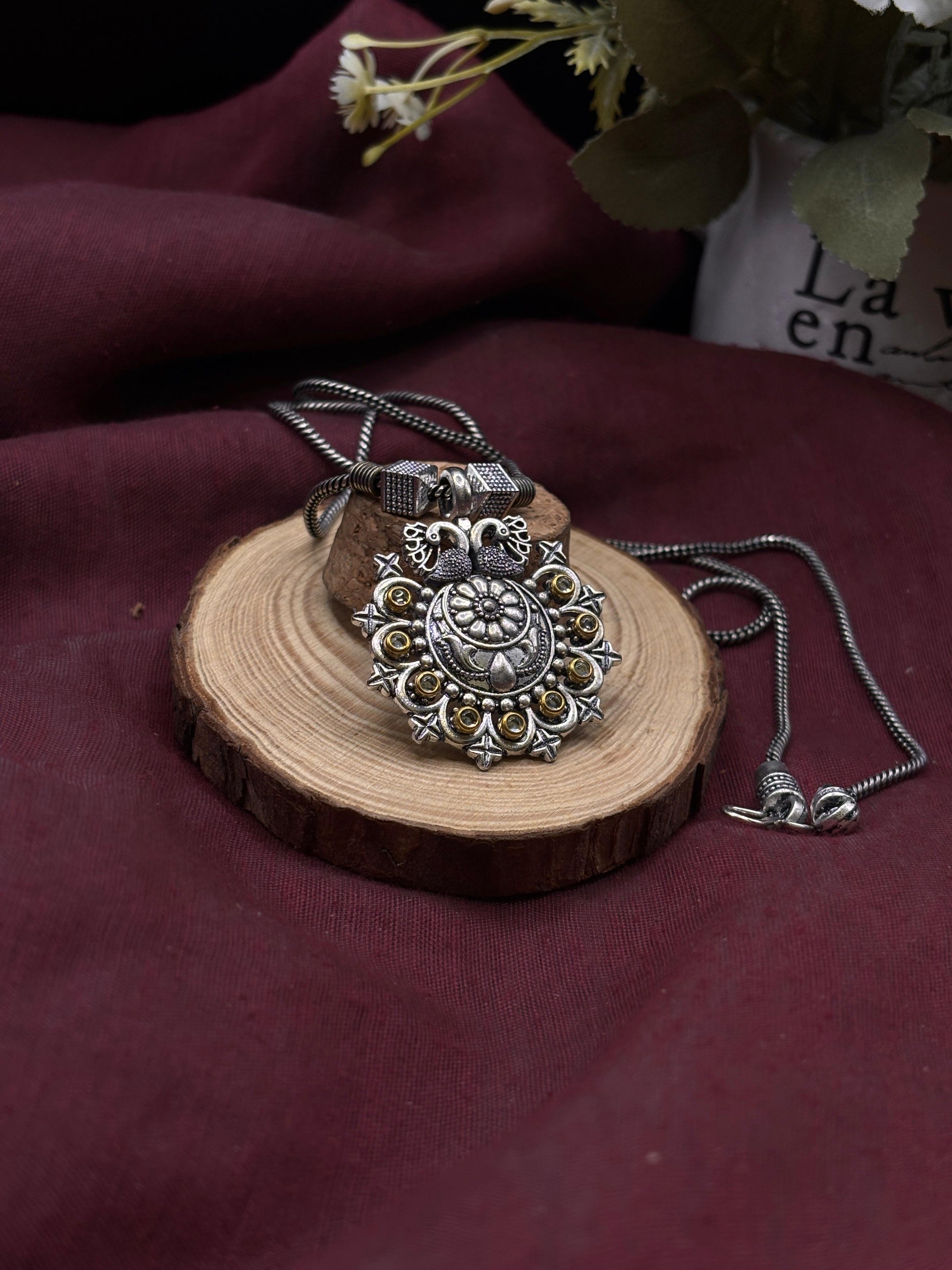 Expertly crafted from true german silver , this is intentionally darkened through a chemical process using liver of sulfur. This carefully applied oxidized finish gives the jewelry a beautiful tarnished effect, adding depth and character to its design. Each bead and intricate detail of the mala reflects the artistry and heritage of Indian jewelry, making it a cherished piece for those who appreciate cultural elegance.
