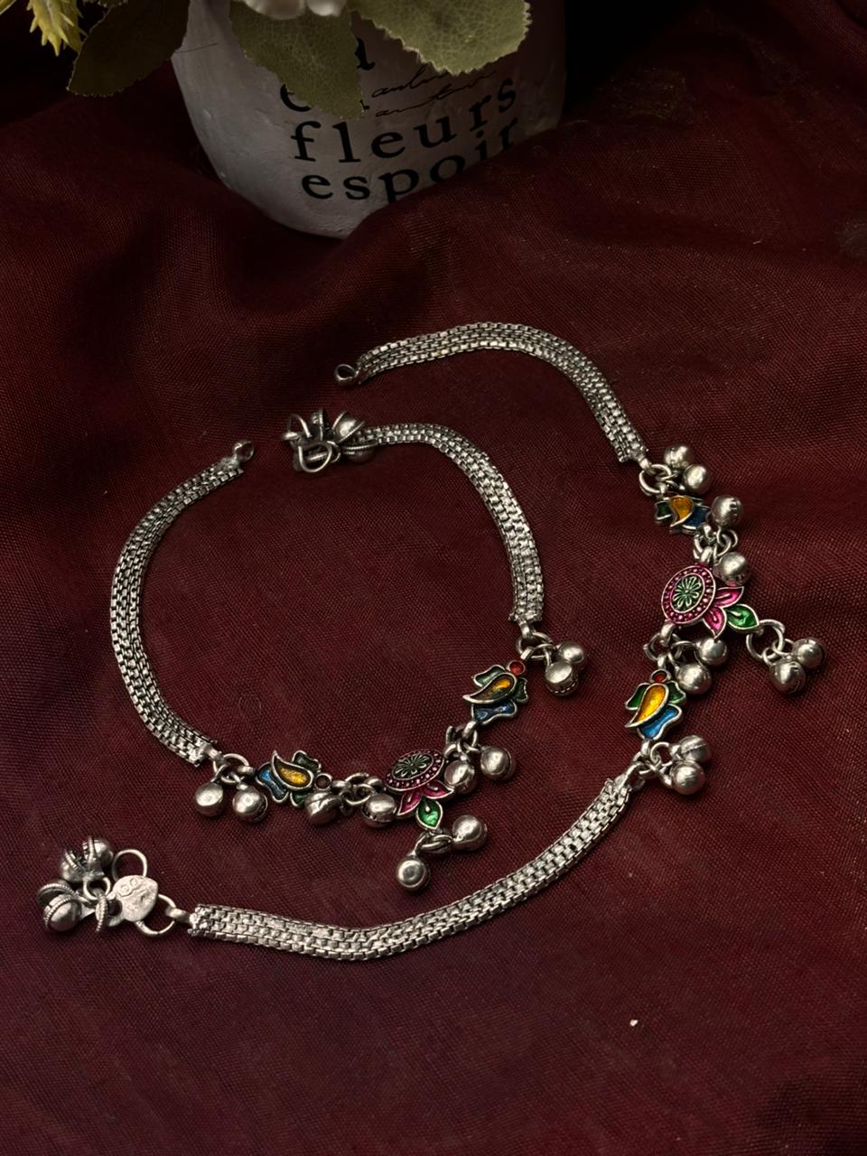 Adorn your ankles with the classic beauty of our Oxidized Silver Payal , a piece that exudes traditional charm and artisanal craftsmanship. This payal (anklet) is perfect for adding a subtle yet captivating touch to any attire, from festive outfits to casual wear.