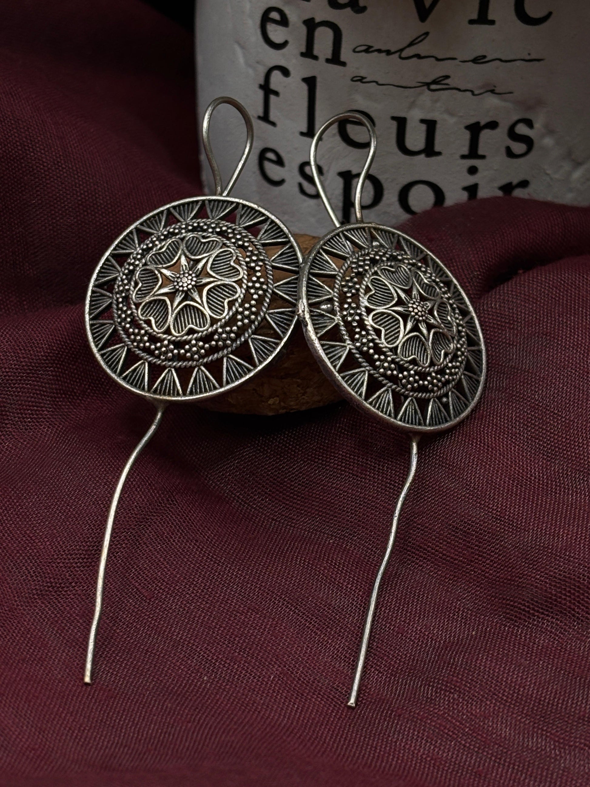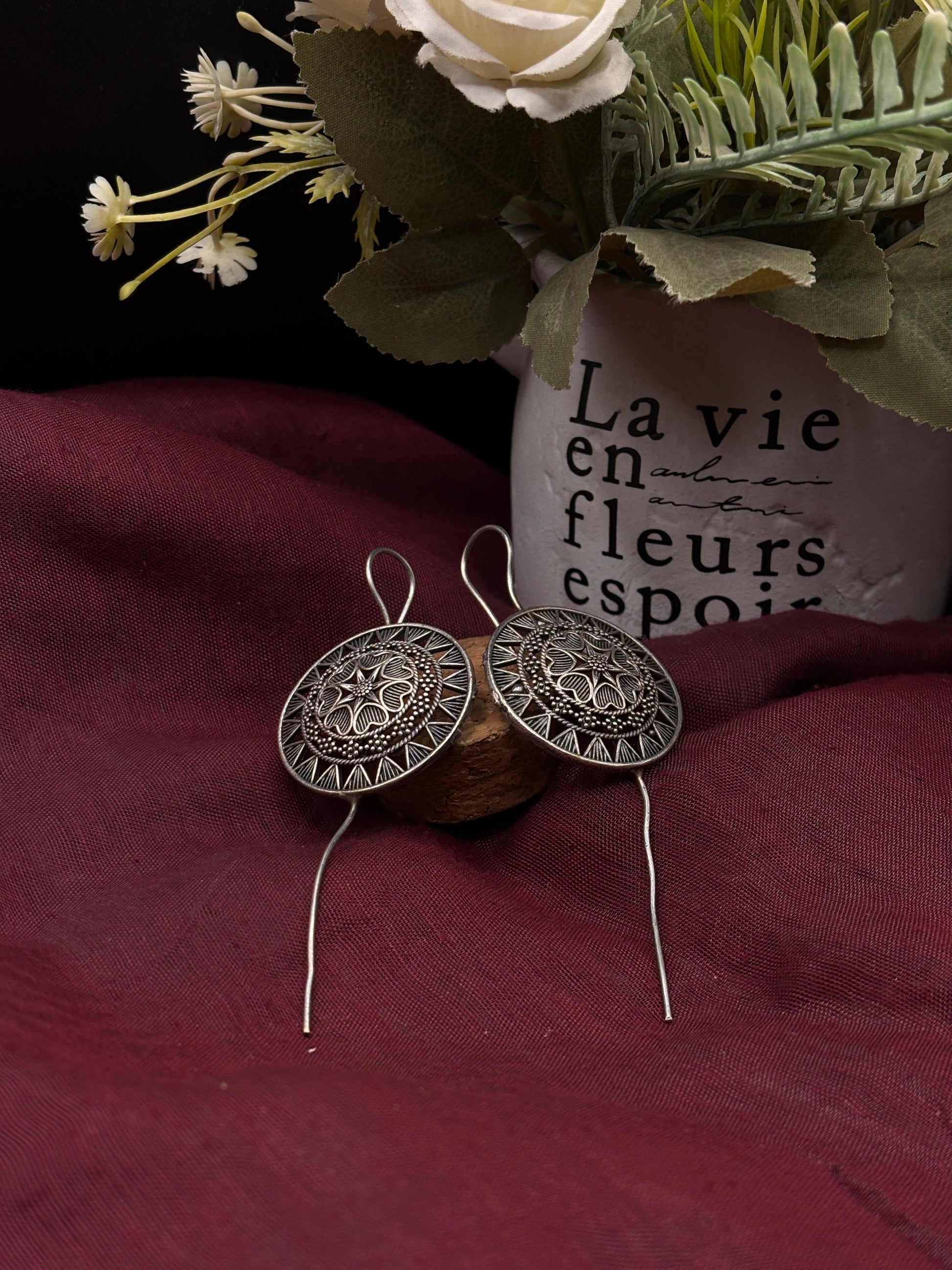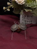 Crafted from german silver , these earrings are specially treated to achieve a unique darkened surface using liver of sulfur, a chemical process that adds depth and character to the metal. This oxidized finish highlights each detail, giving the earrings a vintage-inspired patina that enhances their artistic appeal.