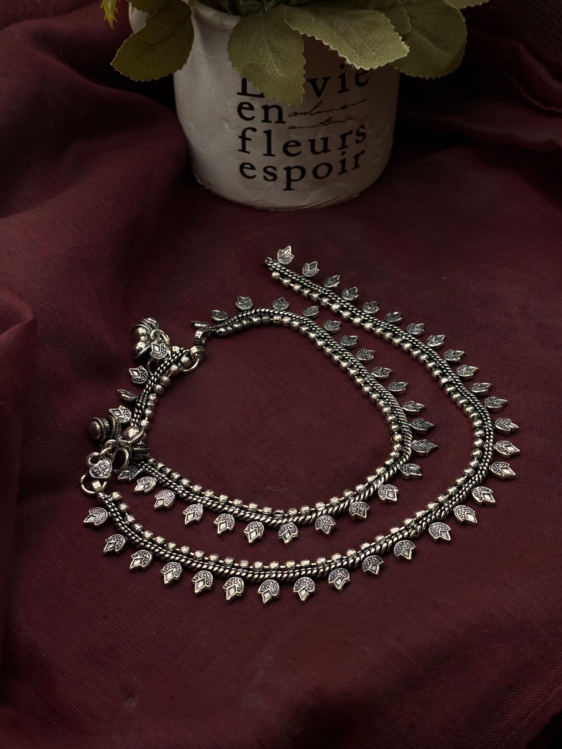 Crafted from authentic oxidized silver, this payal is treated with a specialized chemical process using liver of sulfur to achieve its darkened, antique finish. This tarnished effect highlights the intricate detailing and depth of design, giving it a unique vintage appeal that is both elegant and evocative of traditional Indian jewelry-making techniques. This two-piece set allows you to adorn both ankles in perfect harmony, highlighting the artistry and tradition of Indian jewelry-making.