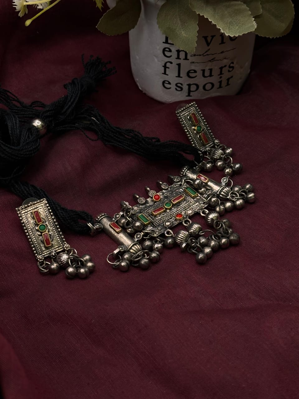 This choker set exudes a royal, vintage aesthetic, with its oxidized silver detailing perfectly balanced by golden floral accents. The central pendant, featuring a delicate pink stone, adds a hint of feminine grace, making it a versatile accessory for traditional and fusion wear. Whether paired with ethnic ensembles or modern silhouettes, this fancy oxidized choker set is a must-have for those who appreciate the art of fine jewelry.