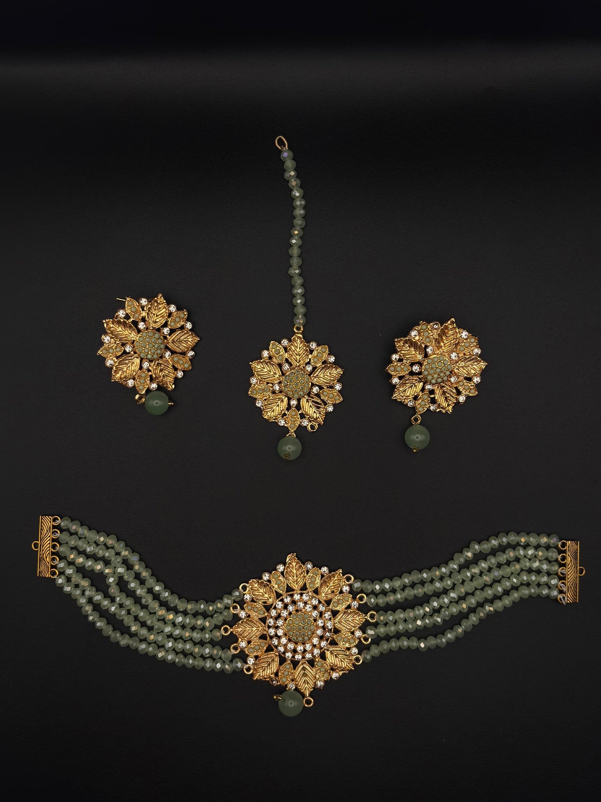 - Luxurious Choker with precious Round Shaped Zircon gemstones embedded comes with Adjustable silver Dori.